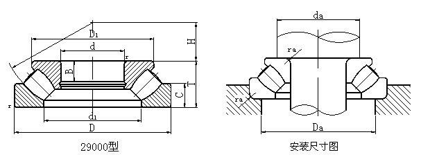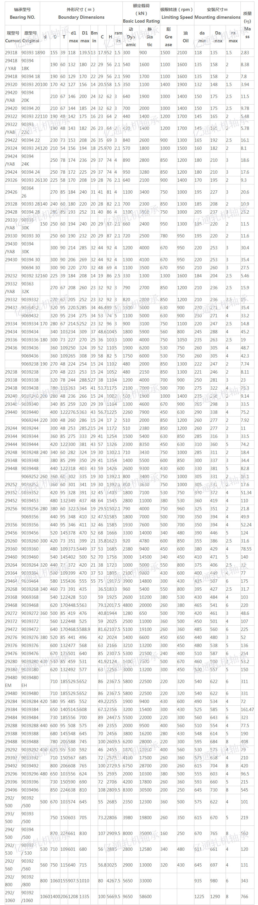 該類軸承主要應用于承受以軸向負荷為主導的軸、徑向聯合負荷,單徑向負荷不得超過軸向負荷的55%,與其他推力滾子軸承相比,此種軸承摩擦系數低,極限轉速高,且具有調心性能,本型錄所列29000型推力調心滾子軸承為經過優化設計的加強型軸承,此種軸承的球面滾子為非對稱性球面滾子,能減少滾子和滾道在工作中的相對滑動,并且滾子長、直徑大、滾子數量多、負荷容量高,通常采用油潤滑,轉速較低時也可脂潤滑。